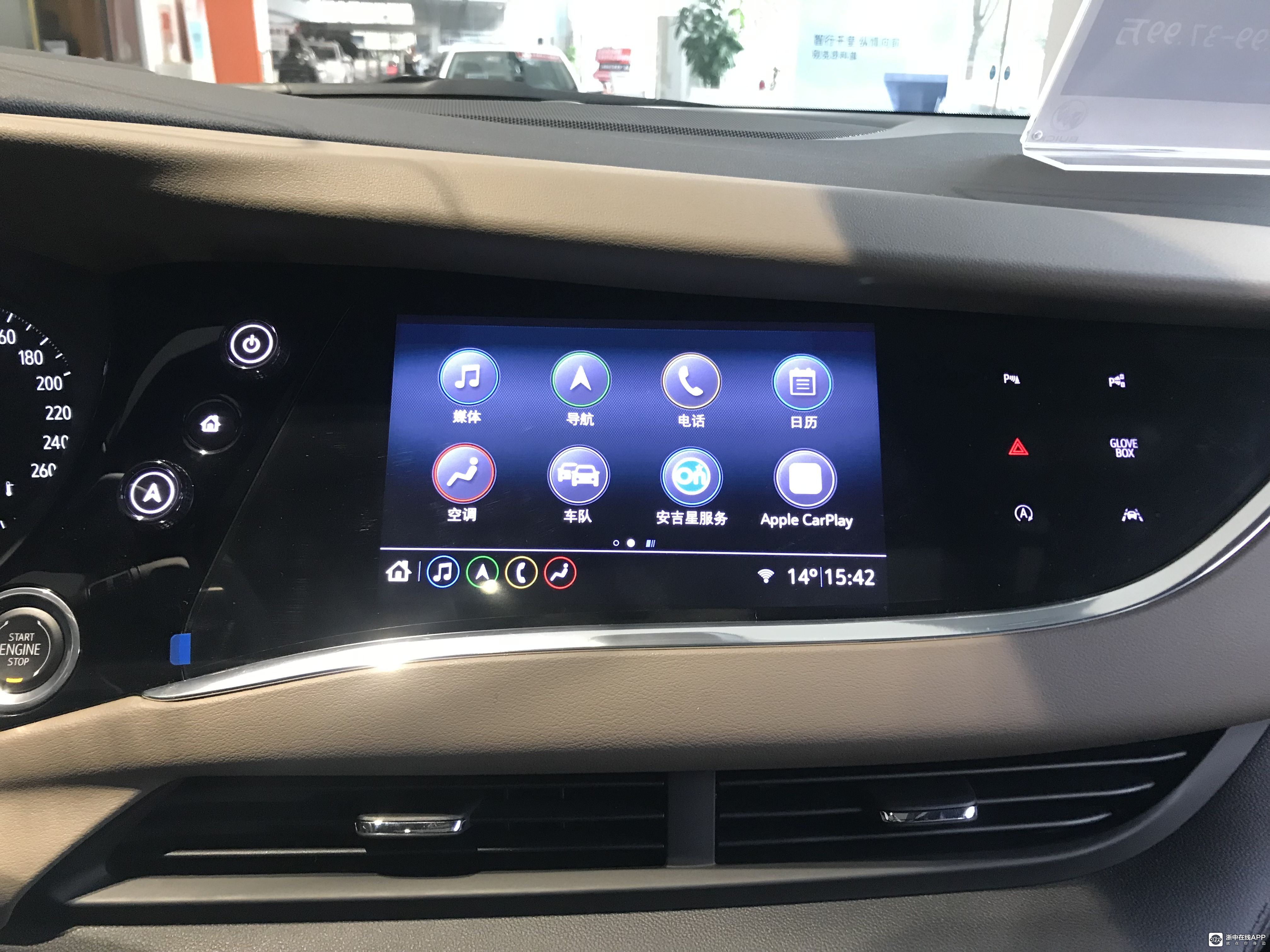中控台配备了8英寸的屏幕,尺寸不大,在豪华感上有所欠缺,但好在屏幕的清晰度、触感流畅度都值得肯定,Apple Carplay,安吉星服务等功能也十分好用。